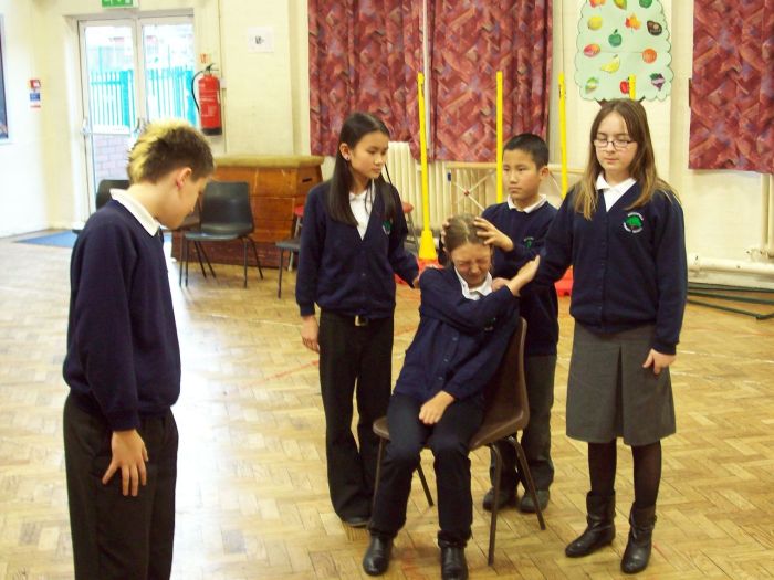 Greenfield Primary, Walsall, Yr 6R Literacy Class creating Tableau of a scene from The Demon Headmaster by Gillian Cross