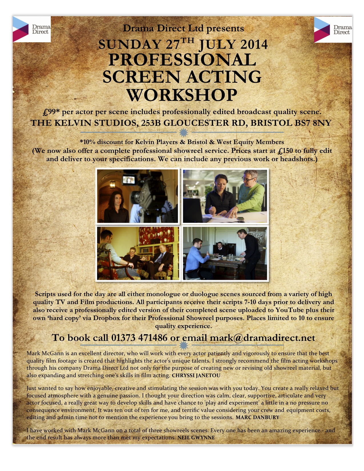 SCREEN ACTING WORKSHOP BRISTOL SUNDAY 27th JULY 2014 Drama Direct Ltd / 27/06/2014 Go backYour message has been sent Name(required) Warning Email(required) Warning Enquiry Warning Warning. Submit Δ Share this: Click to share on X (Opens in new window) X Click to share on LinkedIn (Opens in new window) LinkedIn Click to share on Tumblr (Opens in new window) Tumblr Click to email a link to a friend (Opens in new window) Email Click to share on Pinterest (Opens in new window) Pinterest Click to share on WhatsApp (Opens in new window) WhatsApp Click to share on Facebook (Opens in new window) Facebook Like Loading...